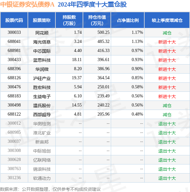 中银证券安弘债券A为债券型-混合二级基金,根据最新一期基金季报显示,该基金资产配置:股票占净值比17.29%,债券占净值比106.21%,现金占净值比1.12%。基金十大重仓股如下:
